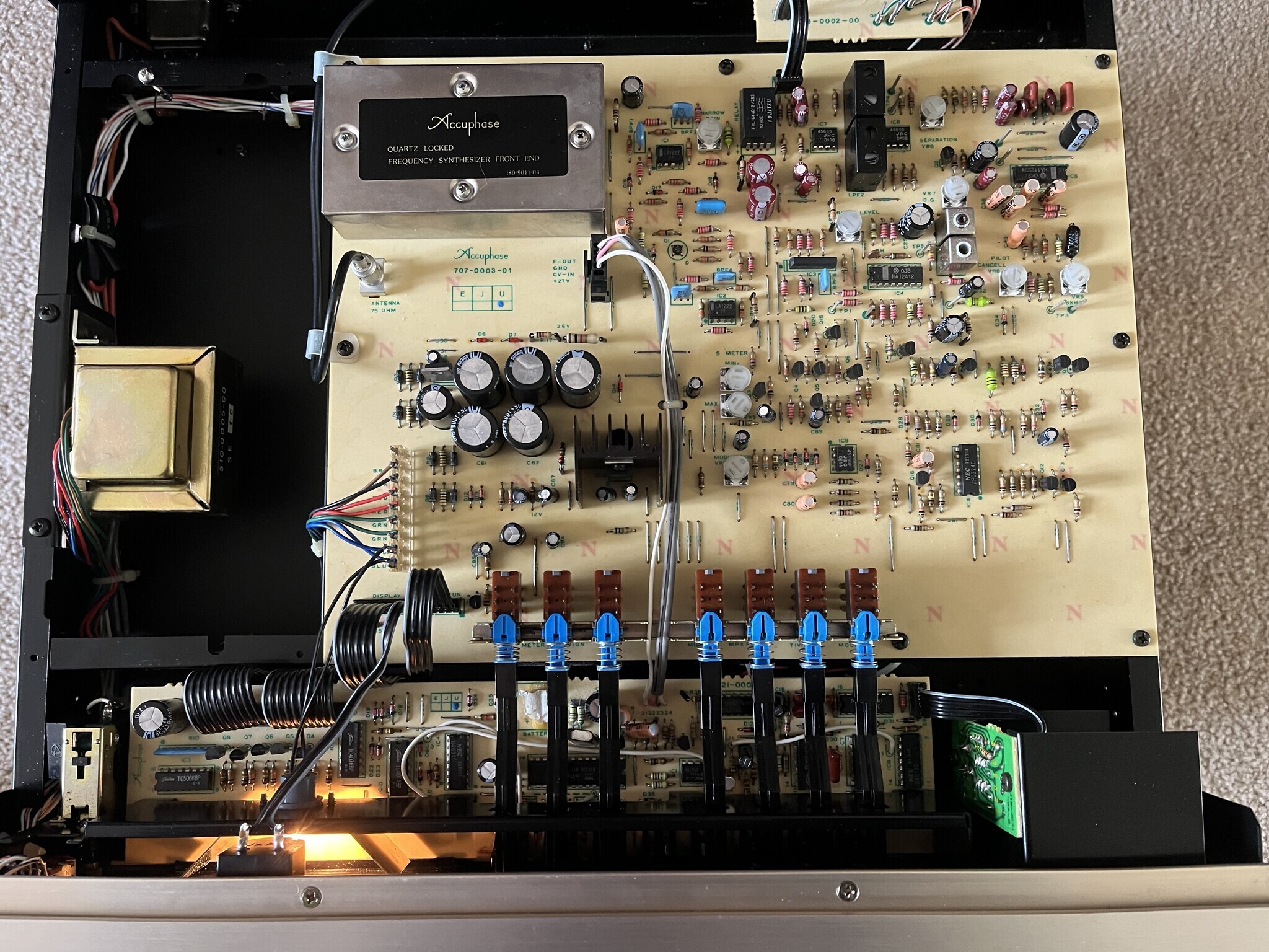 "The power supply employs a toroid transformer with a 115/230 volt line selection via jumper wires. The power supply board has a total of 39,270 µF of filtering distributed on four different voltages. This total capacitance excludes the separate filtering on the IF/Detector/MPX/buffer board which is at least 54,400 µF (8 x 6,800 µF) total. At the PAL antenna inputs, a relay is employed to switch between antennas A and B. Antenna input B has a 10 dB pad.