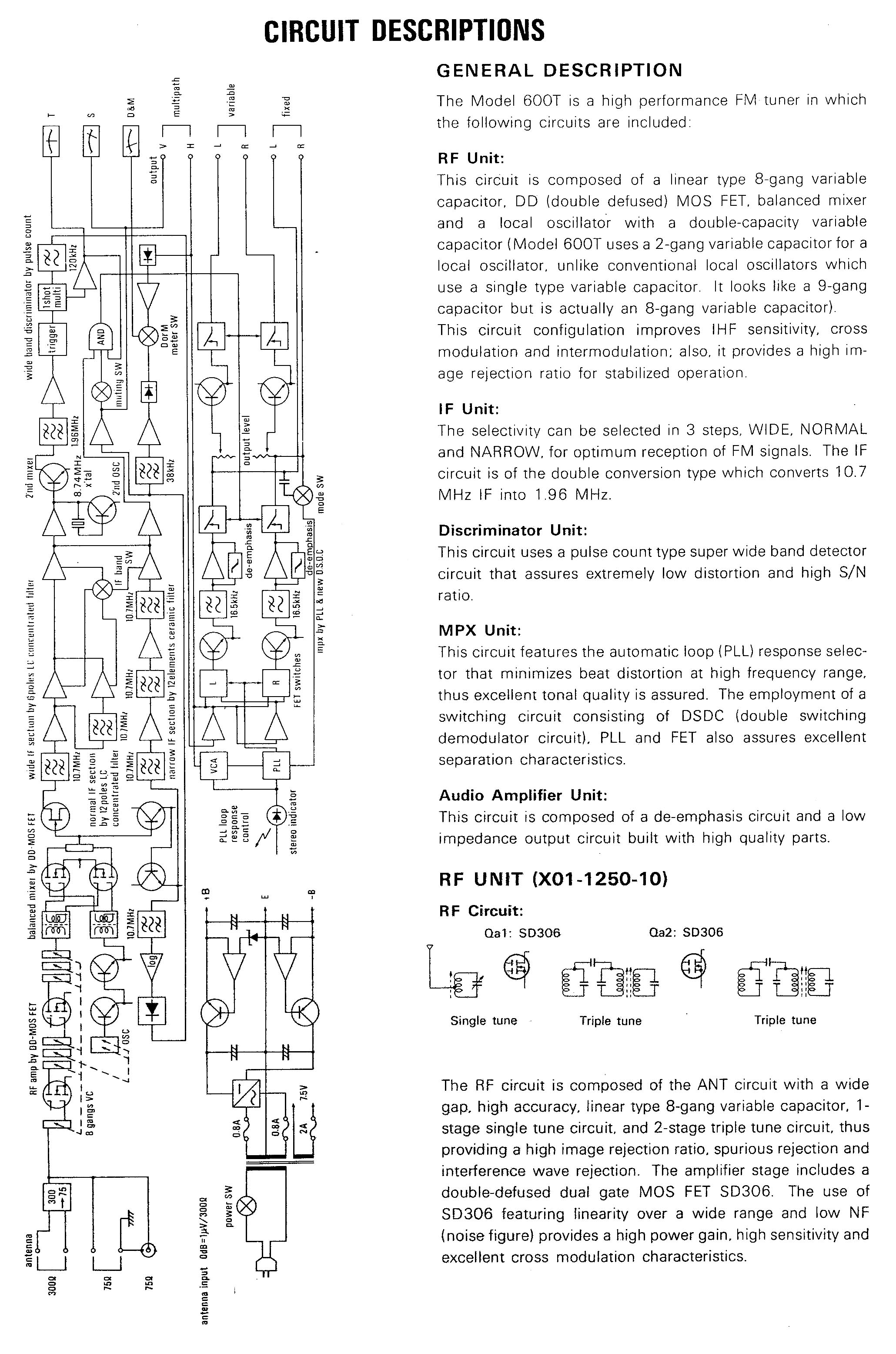 "The front end is quite unique as it sports 5 FM gangs but two of them are in the local oscillator circuit as the LO is double-tuned and buffered. RF-wise it has the usual single tune, FET amp, double tune, mixer line up. BUT! There is a front-panel selector for RF mode. Normal mode is as described but direct mode bypasses the RF amp, leaving a triple tuned - mixer setup. This drops the sensitivity about 15 dB, giving the front end high selectivity and resistance to overload. Great for the urban dweller. The IF stages are Wide/Narrow selectable with two 250 kHz GDT ceramic filters in Wide and two 220 kHz CFs put between them in Narrow. Further on is the Kenwood quadrature pulse count detector and the well-regarded HA11223W multiplex chip. Audio out is IC buffered and there is active LPF filtering. All this adds up to a very good performing FM tuner. As a bonus the Wide/Normal bandwidth selector also affects the AM band, giving it better than usual performance. Even the power supply is special, with a separate transformer powering the digital circuitry to keep that potential noise out of the signal chain.