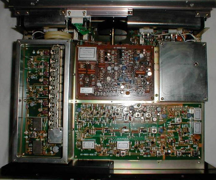 Our contributor Brian Beezley points out that "narrow filter replacement is easy in the L-07TII despite the stock 4-pin filters. The PCB has six holes for each filter, each set correctly spaced and wired for a pair of 3-pin filters. So you can install a total of 6 filters in narrow if you want." The two normal 3-pin, 2-stage ceramic filters (lower right in the photo) are apparently used only to run the meters and are not in the IF signal path. Here's a wider shot of the inside of the L-07TII. The L-07TII uses Kenwood's pulse count detector circuitry, like the 600T and KT-615/815/917, and sounds extremely quiet. Post-mod, it is comparable to a modified KT-8300 for DX performance, but maybe not quite as sensitive as the 600T. See how one L-07TII sounded compared to other top tuners on our Shootouts page. The L-07TII is scarce and usually sells for $250-400 on eBay, with occasional highs over $600 for mint ones.
