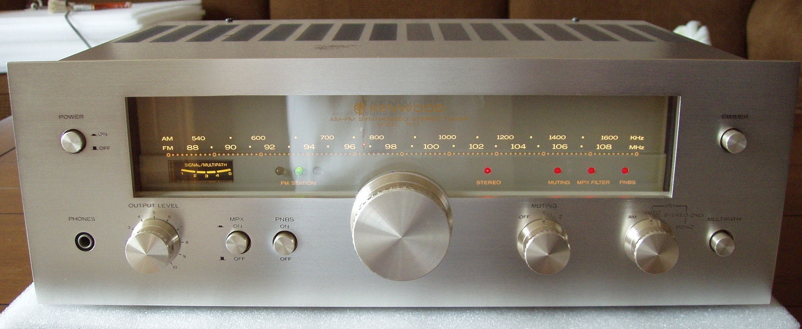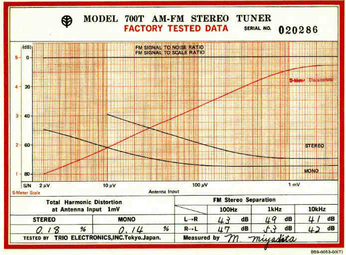 The 700T, which predated the 600T, is a very rare 5-gang tuner whose tuning dial resembles the KR-6600/9600 receivers. According to our contributor Charles, the 700T is the only Kenwood tuner that uses an analog dial to set a digitally controlled oscillator - a very unusual system that is also used in the Pioneer F-28. We don't have much info from users of the 700T, but here's an interesting S/N test sheet courtesy of our contributor Lonnie. The 700T usually shows up only a few times a year on eBay, with sale prices usually between $400 and $550. Be careful: a "very unusual" tuner is not the same as a "great" one.