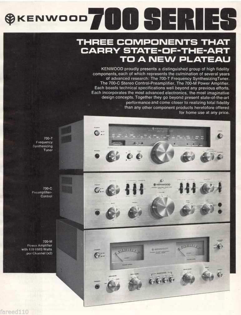 Kenwood 700T (1975, $750, front, B&W, back, Euro back, inside, with amp and preamp, brochure cover, ad 1, ad 2, schematic 1, 2, schematic left, right, detector/MPX scheme: ratio detector, diode bridge MPX, PLL generated 38k with upc33C chip)