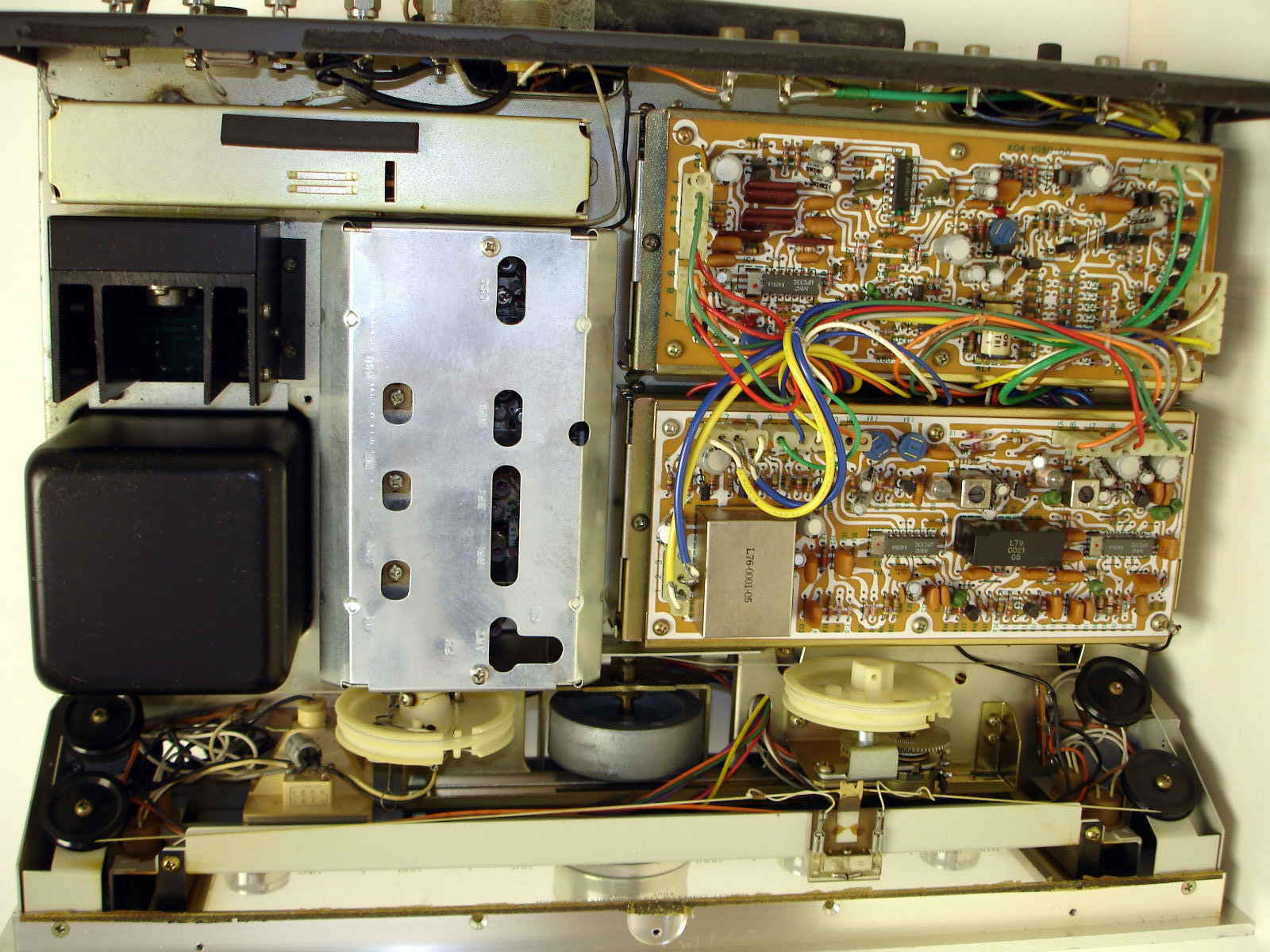 The L-01T is an extremely rare FM-only tuner that is seldom offered for sale in the U.S. Our panelist Jim was lucky to have a chance to play with one: "The inside of the L-01T is amazing, with two potted transformers and 3 full wave bridge rectifiers for 3 totally separate regulated supplies. The first, +12V, feeds the first oscillator circuit (assumed to be the local oscillator feeding the mixer), a dedicated supply back to the transformer for the ultimate in LO stability. The second and third, fed by the other transformer, has separate windings for the MPX/audio section (+/- 16 volts) and the +14 volts for the front-end IF section. This very healthy power supply sits on its own board. There is a pivoting arm for the dial pointer wires to move freely. There are 7 gangs in the front end, as follows: antenna in, switch, single tuned gang, double diffused MOSFET gain stage, single tuned gang, JFET buffer/follower, switch, triple tuned 3-gang section, transformer coupled into a balanced mixer. The switch, not seen before in any high-end Kenwood tuner, allows bypassing the first 2 gangs and the MOSFET gain stage for less front-end intermodulation (IM) distortion with high input signal levels. Finally, two gangs are used in the local oscillator, which is buffered and also includes a touch switch-controlled varactor-tuned feedback stage from an IF IC, looking very similar to the KT-917's distortion reduction circuit.