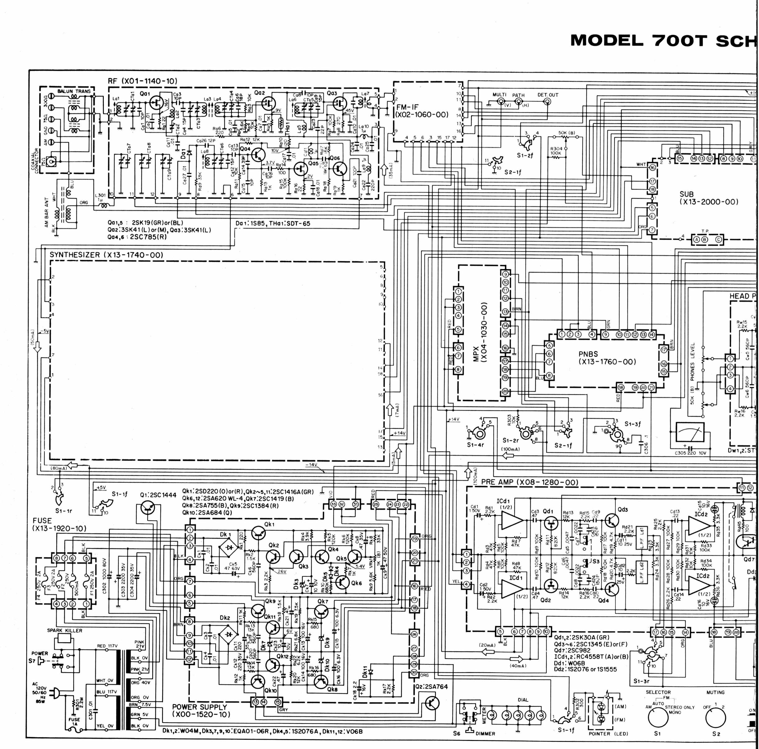 back with amp, brochure, ad, block diagram, schematic 1, 2, 3, 4, detailed specs, detector/MPX scheme: pulse count detector, charge injection cancellation discrete MPX switches, MPX PLL generated 38k with HA1156 chip)