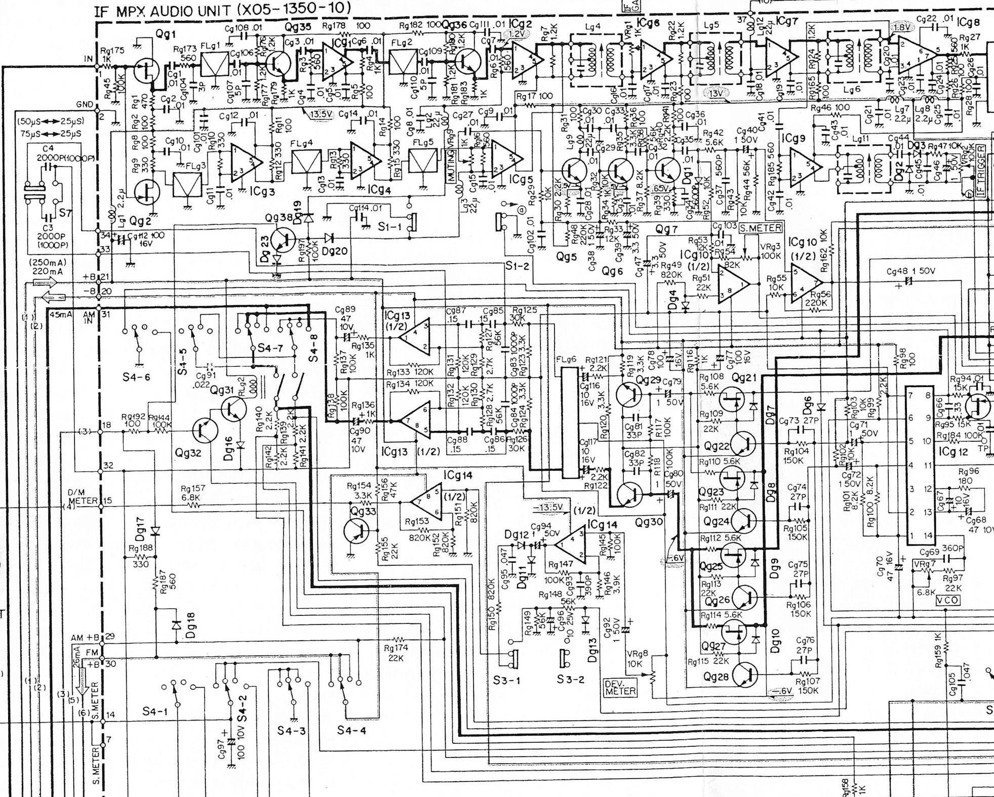 "As in many vintage tuners, the audio path can be shortened - if you can sacrifice the calibration tone and muting, a direct run with good coax from FL3 to the MPX would be possible (you'll need to use a coupling cap - e.g. 105/225 63V 1050 or 3.35 film and remove C33 and C40), and the overly long PCB traces from resistors R39 and R40 to output coupling caps C51, C52 can also be shortened. One would need to check whether C51 and C52 can be omitted altogether; if you keep them (I'd suggest replacing them with 105 63V 1050 electrolytic or somewhat lower capacitance - e.g. 3.35 - film types), do not remove 100k resistors R41 and R42 as these avoid getting an undefined potential (and thus possibly arcing due to overvoltage inside the caps) if the amplifier connected also uses coupling caps on its inputs (which, as it happens, is the case for the headphone amp that I use with my KT-80). The most critical coupling caps IMO are C49 and C50 near the MPX filter, which are only 3.35 but should be 105 or better 225 (225 63V 1050 types should still fit I think) for optimum performance. (Again, film caps could be a bit smaller, 4.75 would do.) The small brownish electrolytics around the MPX are low-loss types from ELNA, where many of the 'lytics and the PCBs seem to be sourced from. If they are replaced, use film types of the same value. (European manufacturers like Grundig used these, but I guess in Japan they were too expensive and locally available good electrolytics were employed instead.)"