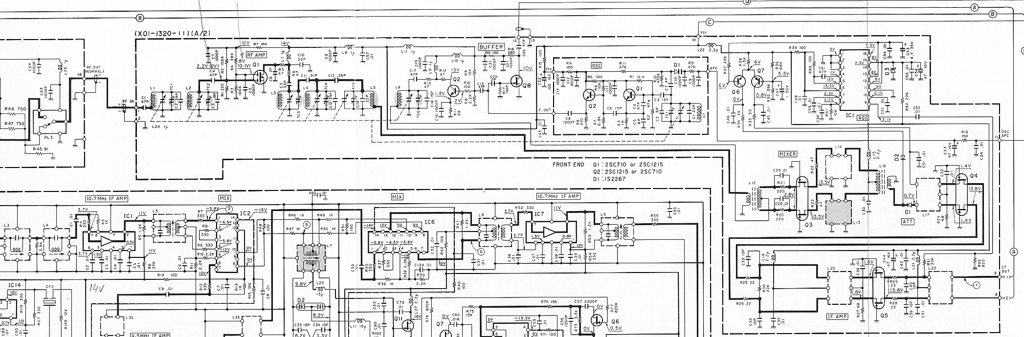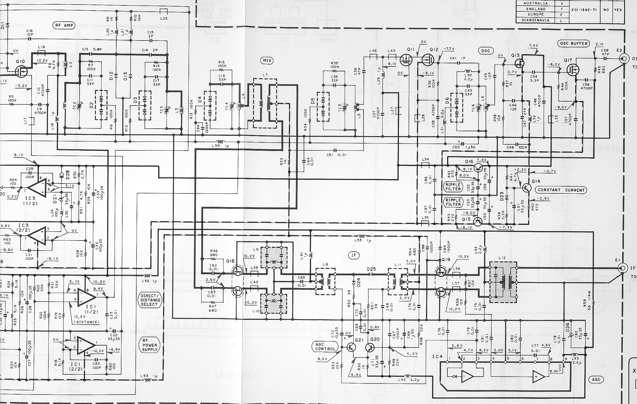 Our contributor Georges tells us that the KT-917 has "two RF amplifier transistors Q1 and Q2 (Q2 being a common gate amplifier) before the diode doubly balanced mixer." And the KT-917's service manual says, "The RF amplifier section has a wide-gap, 9-gang variable capacitor for the double-double-triple tuning system (one tuning stage for ANT, and two tuning stages for RF). The CC3588DE used as Q1 is a DD-MOS FET (selected SD-306) which features low noise and superior square response over a broad input level/frequency range. It also features a high power gain. VR1 adjusts Q1's input response to its maximum linearity. For servicing adjust VR1 so that the maximum deflection of the S-meter can be obtained. In the second stage, another double-tuning circuit is coupled to a common-gate amplifier, which features a lower input impedance and stable amplification with no influence from feedback admittance."