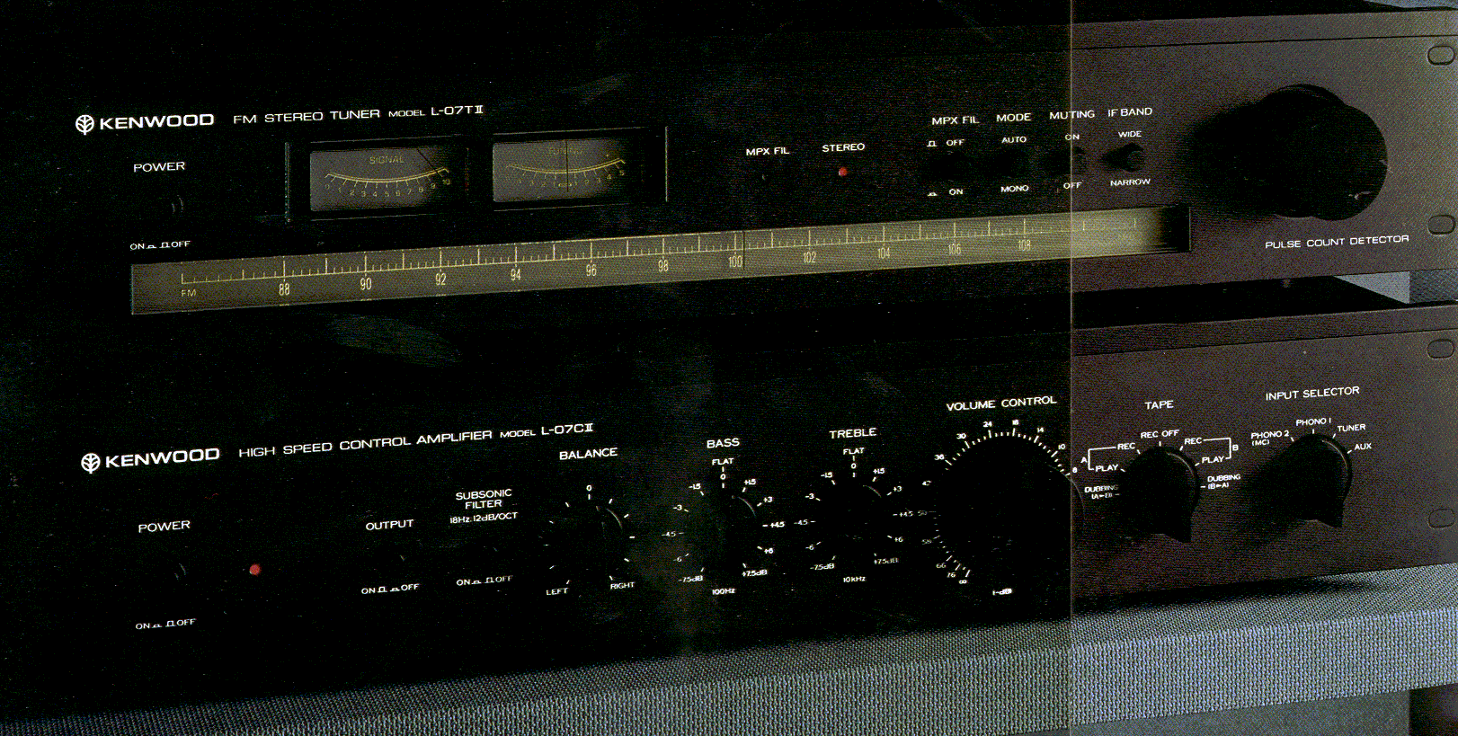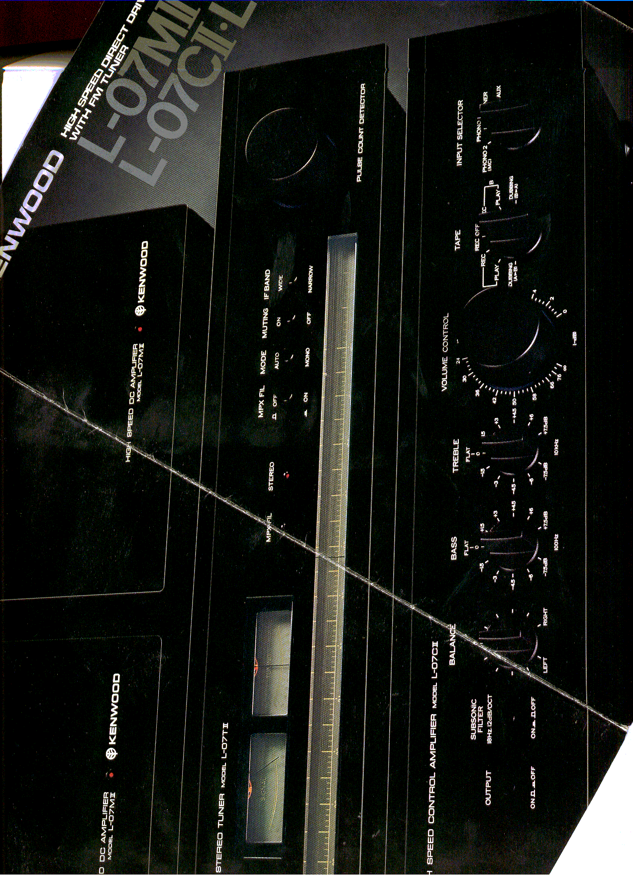 Kenwood L-07TII (1979, $625, photo, brochure cover, brochure page1, brochure page2, with L-07CII amp, detector/MPX scheme: pulse count detector, IC based MPX HA11223)