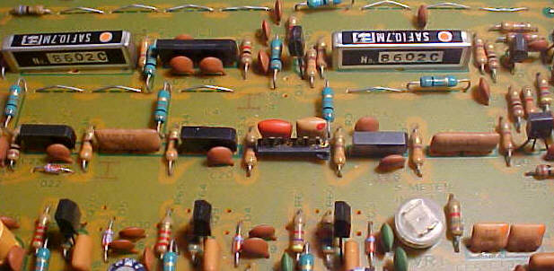 The FM-only KT-917 was the successor to the 600T as Kenwood's flagship tuner. The KT-917's front-panel controls are identical to those of the 600T, which led some bygone internet commentators to assume erroneously that the differences between the tuners are merely cosmetic, but the KT-917 is somewhat larger and has very different circuitry inside. The KT-917 has a huge 9-gang tuning capacitor, similar to the 600T's 8-gangs-and-a-jumper capacitor, and the 917 also uses Kenwood's pulse count detector circuitry, but the similarity ends there. Unlike the 600T which uses two parallel filter paths (Wide/Normal and Narrow), the KT-917 uses a single serial IF filter circuit with taps for the three filter bandwidths. It starts with a single ultra wide ceramic filter (there are two other ceramic filters but they're used only for meters and are not in the IF path), followed by a single tuned LC filter in Wide mode, followed in Narrow mode by four Murata "Surface Acoustic Filters" (sometimes called SAW filters, for Surface Acoustic Wave) which were specially designed by Kenwood and are also used in the L-07TII. As each filter is normally two elements, or stages, this would give the KT-917 a 12-element narrow mode, similar to the 600T. (There are two SAW filters in the wide IF bandwidth mode.)