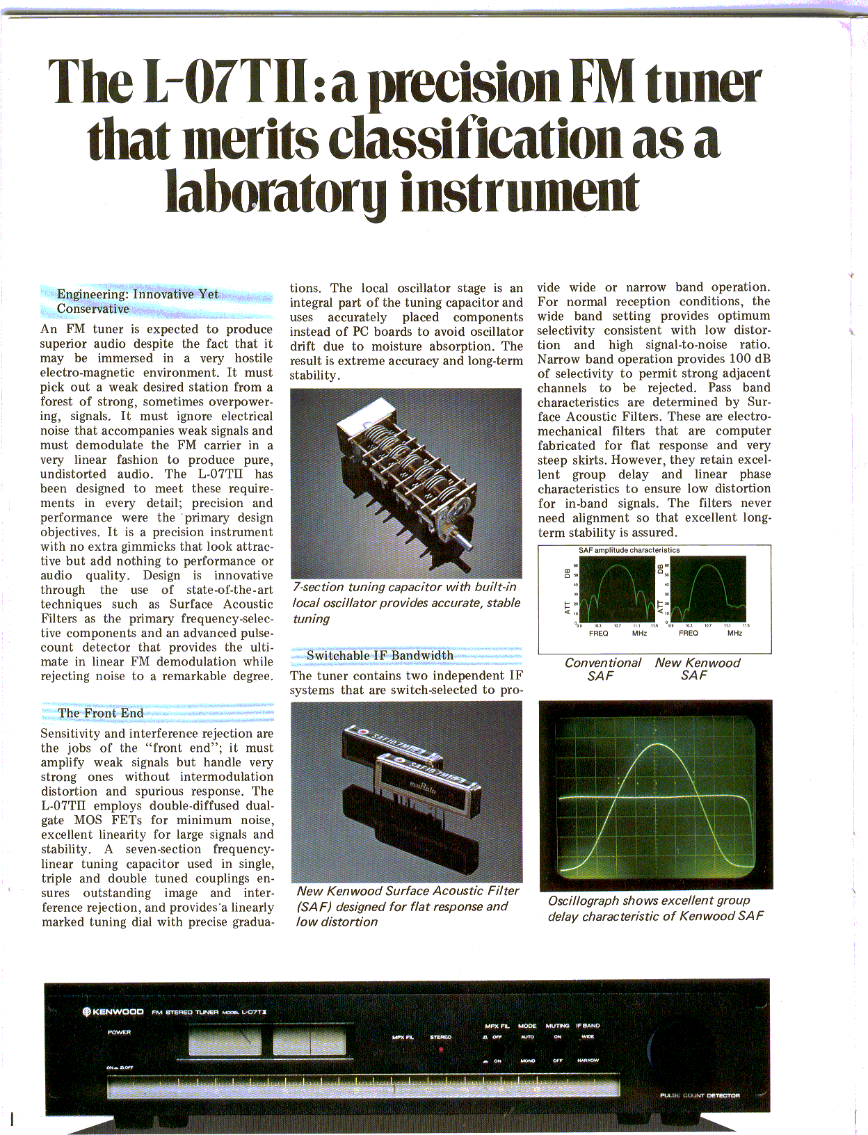 The L-07TII is a sleek, narrow, black, rack-mount style FM-only analog tuner that looks very different from the classic silver-faced Kenwood components. It has a 7-gang tuning capacitor and two independent IF filter systems for the wide and narrow IF bandwidth settings, and is very sensitive and selective unmodified with alternate channel selectivity that exceeds 100 dB out of the box. Any filter modification should probably be done by a pro because the L-07TII contains two Murata "Surface Acoustic Filters," specially designed by Kenwood (top row in photo), for the wide IF bandwidth setting and 3 older-style 4-pin 280 kHz ceramic filters which have 4 stages each (the center one in this photo was replaced as part of a mod) for narrow mode.