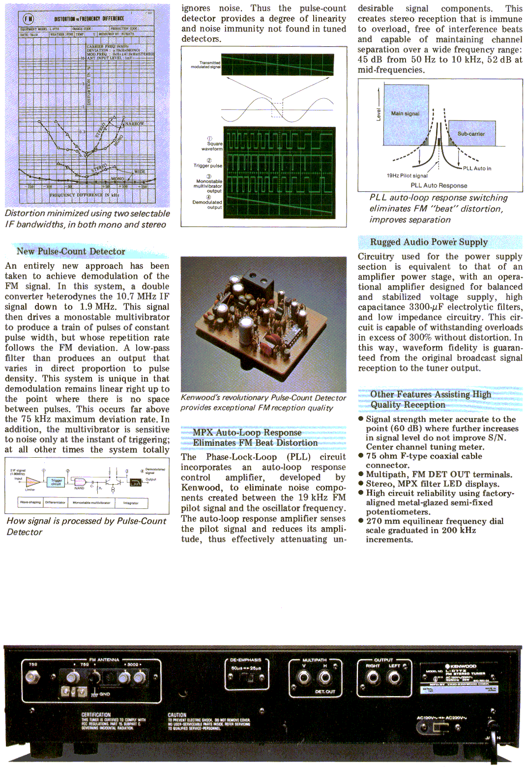 "I think the KT-815 is a very attractive tuner and its layout is practical and uncluttered. Internally, the circuit layout is again attractive and uncluttered. The 5-gang FM front end employs dual-gate MOSFETs as active amplifiers. There is a Touch-Action Servo Lock Tuner that works very well (grabs a station and holds it, but is defeatable). Wide and Narrow IF bandwidth selection. Double Conversion normally found only in professional-grade equipment, which results in dramatic improvement in signal-to-noise ratio when used with the pulse count detector. Pulse count detector ignores distortion by turning each FM wave into a precise and uniform pulse of energy. Pilot Carrier Cancellation subtracts the pilot signal from the audio output signal at no sacrifice to overall frequency response. The Operational Amplifier is powered by a +- dual power supply. It ensures low distortion, wide dynamic range, and low output impedance, and will withstand 300% overload. Powerful, well-regulated power supply with 1,000 microfarad capacitors.