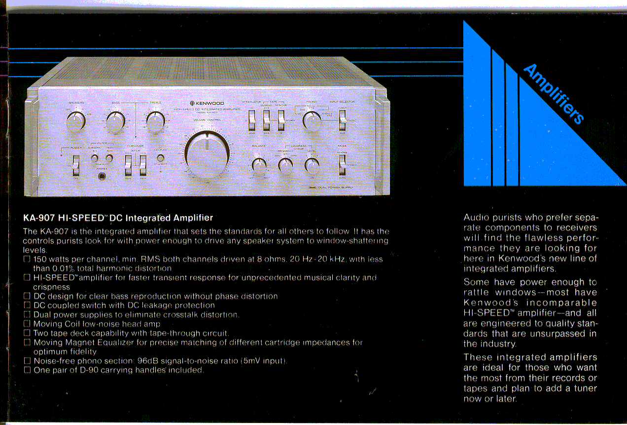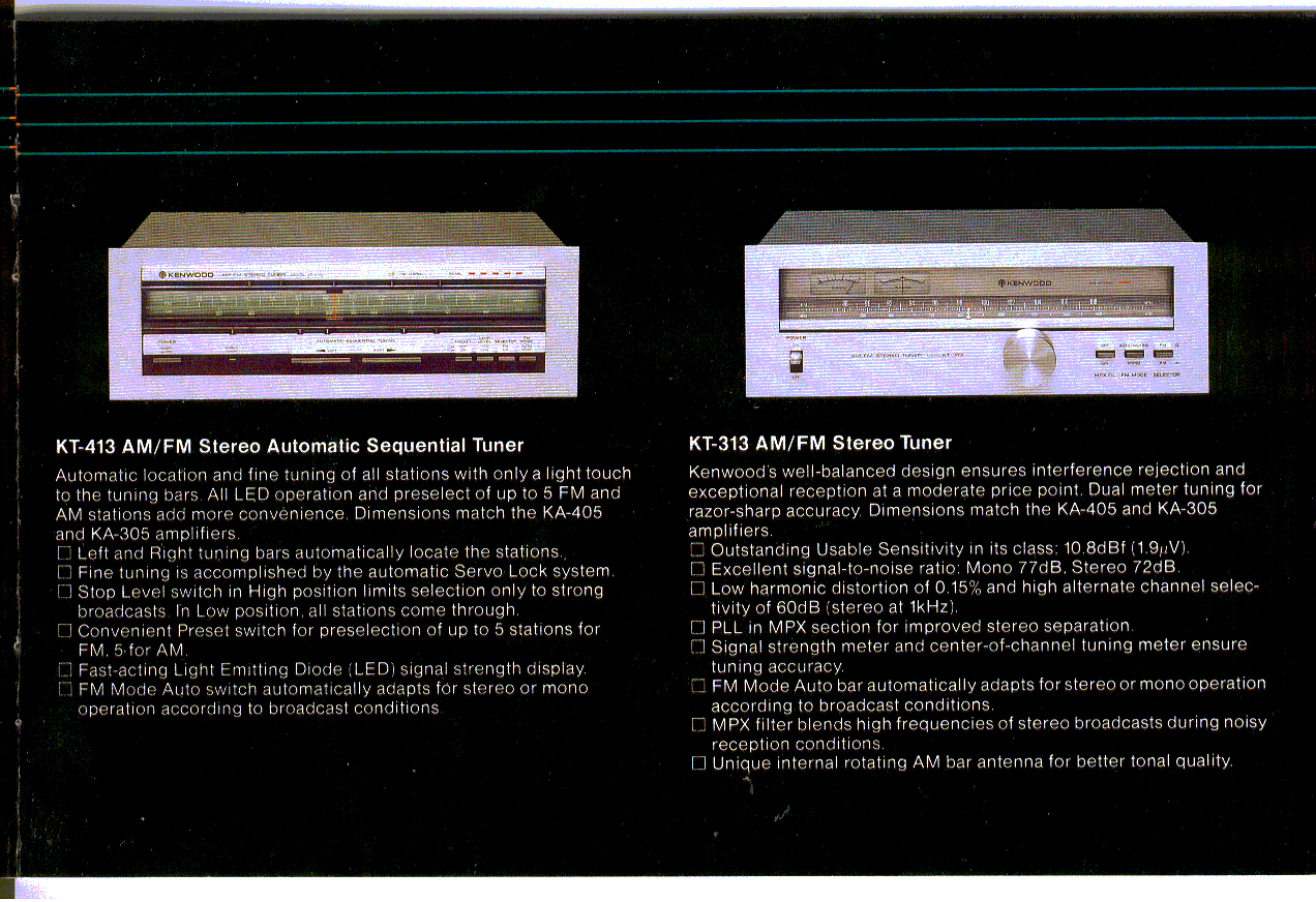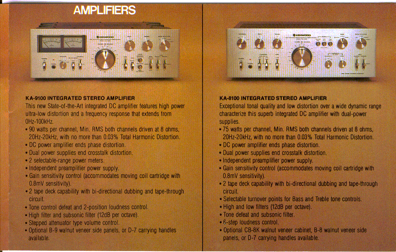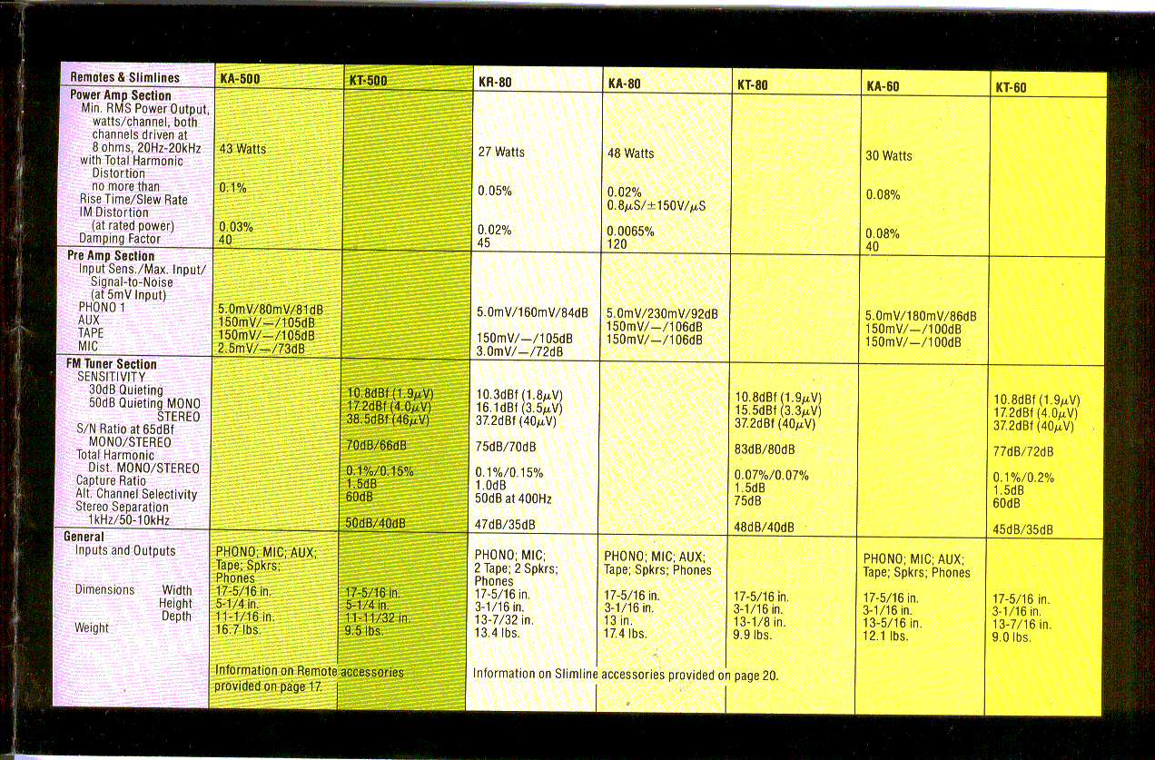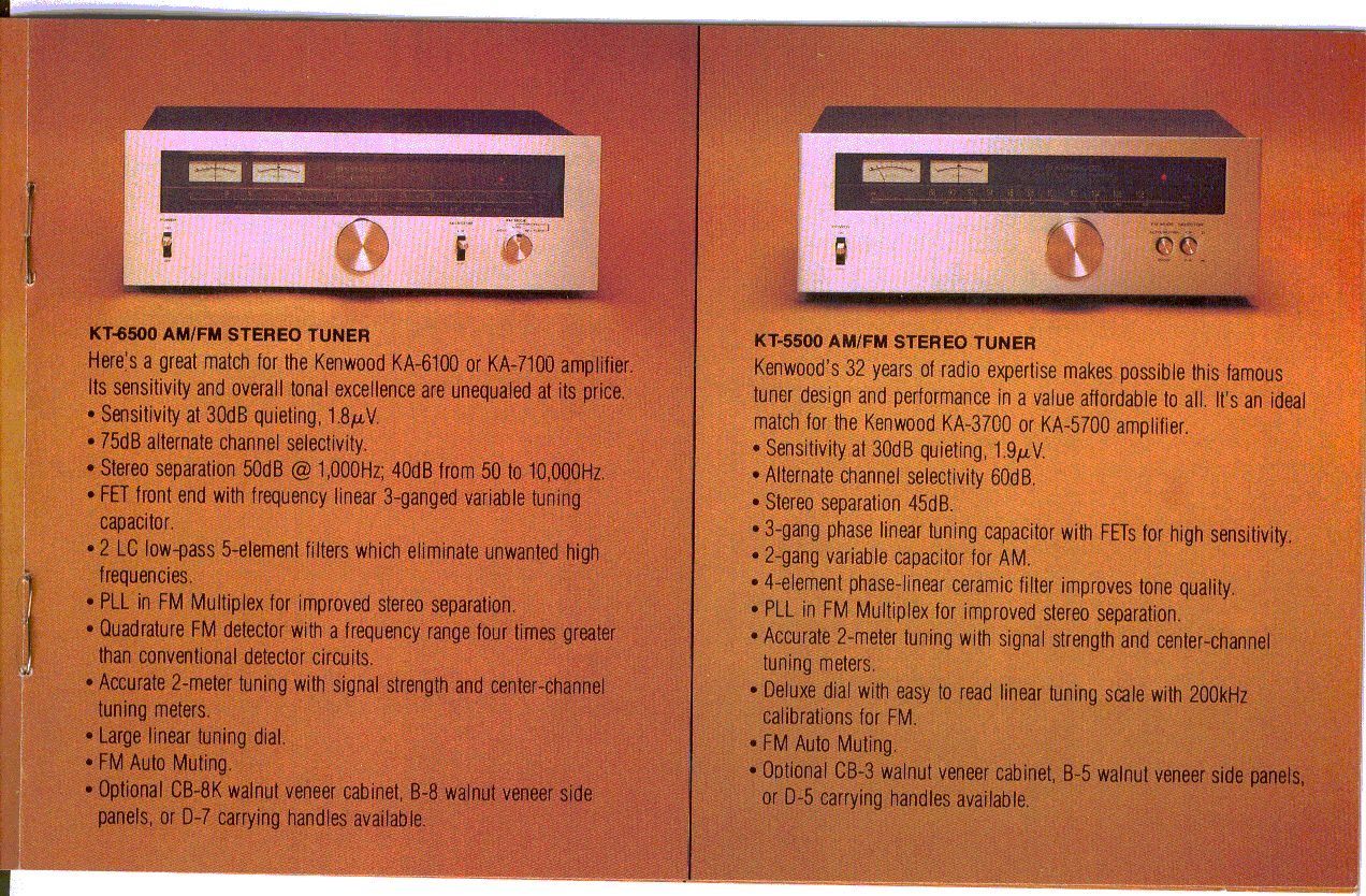 Here are images of the tuner, receiver and amplifier pages from two Kenwood product brochures. Click to enlarge them for best picture quality.