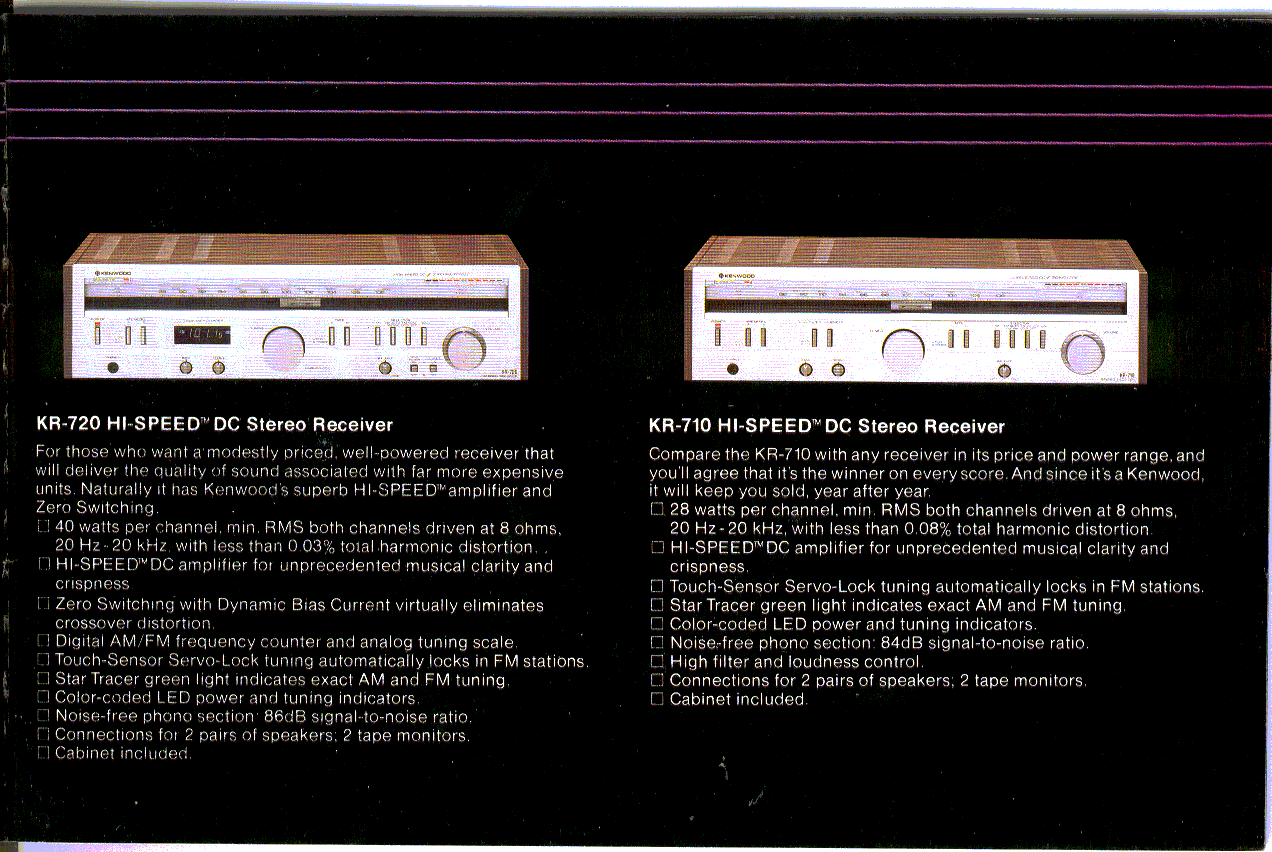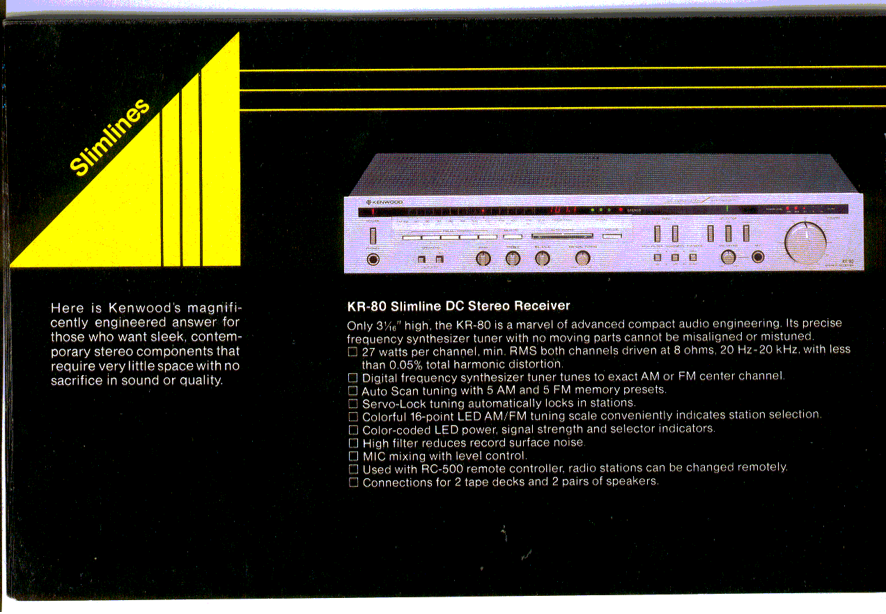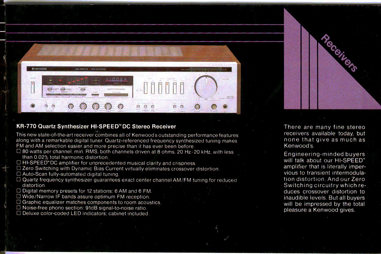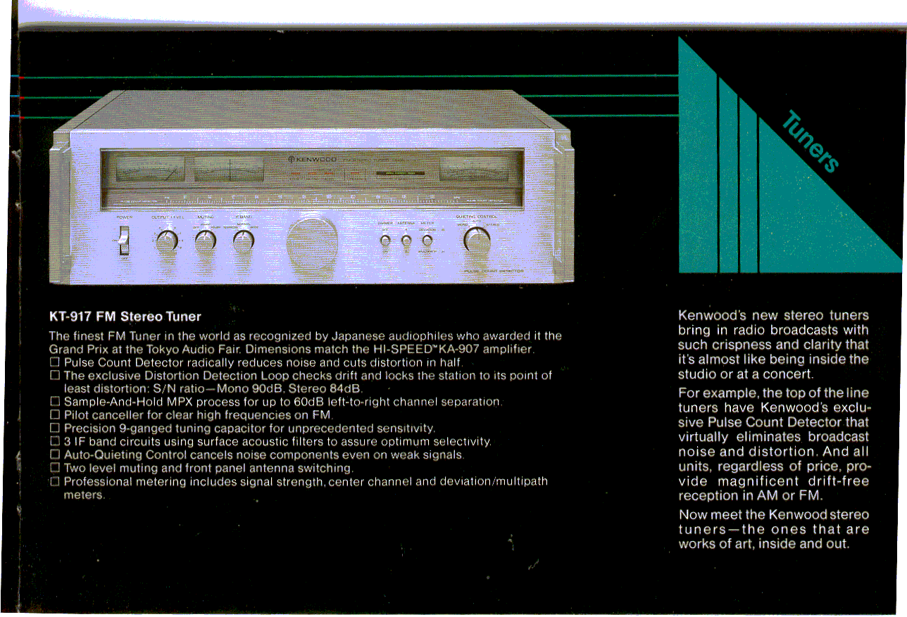 Here are images of the tuner, receiver and amplifier pages from two Kenwood product brochures. Click to enlarge them for best picture quality.
