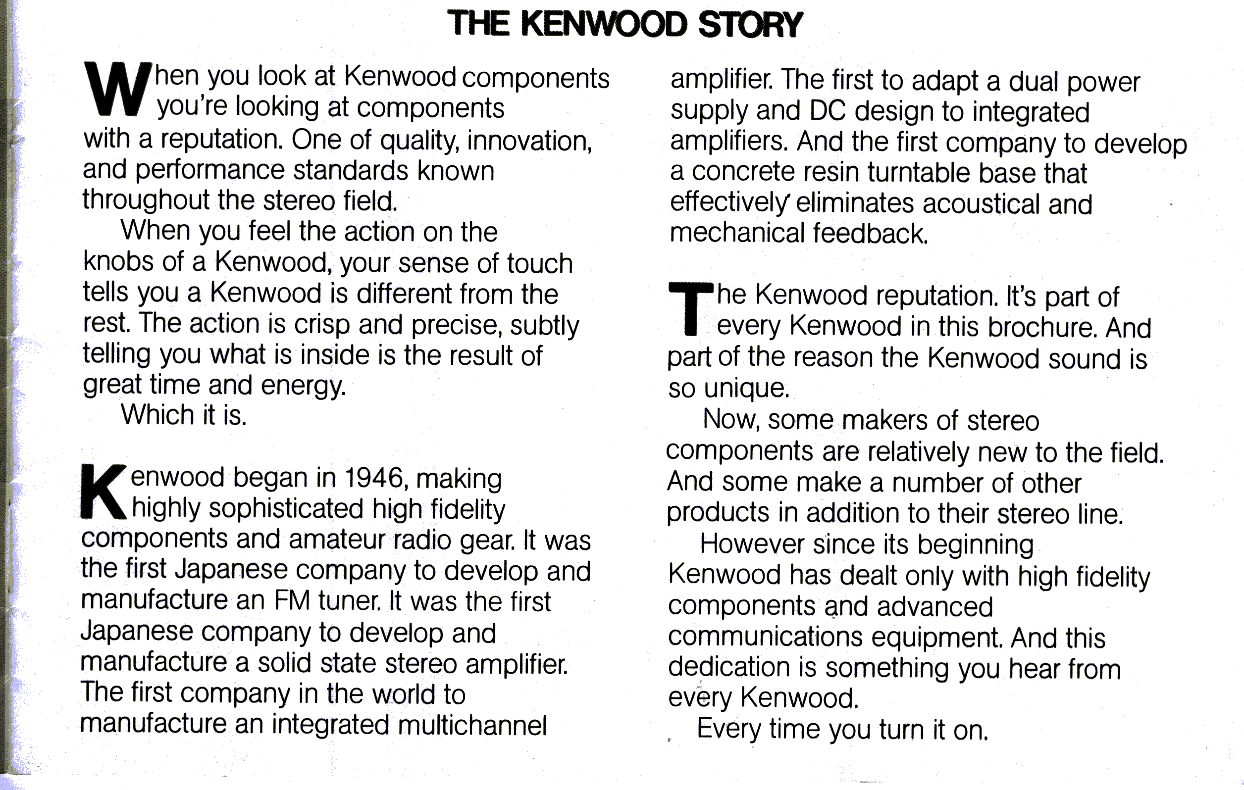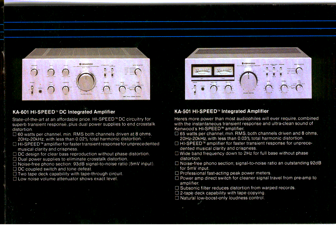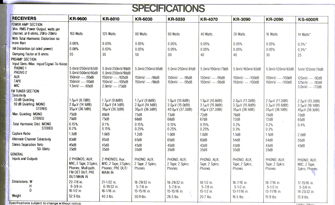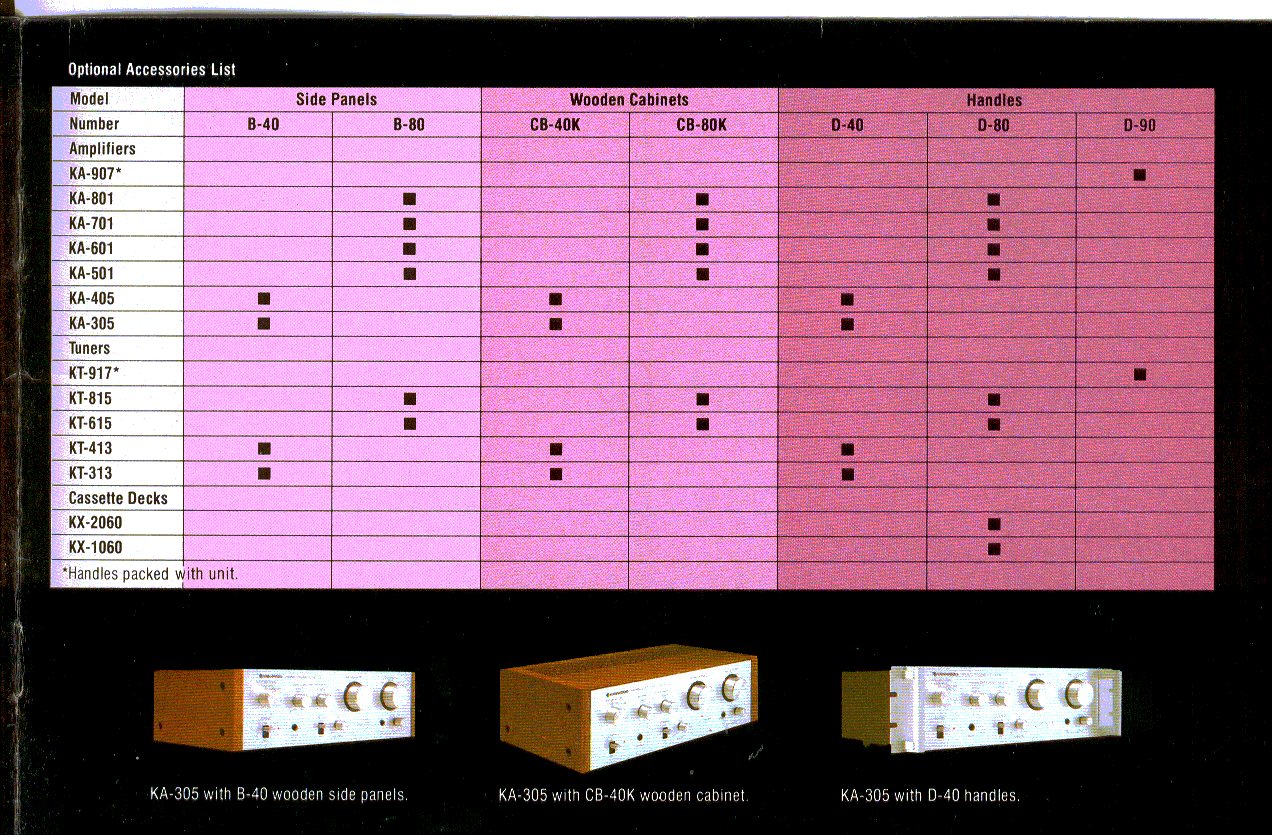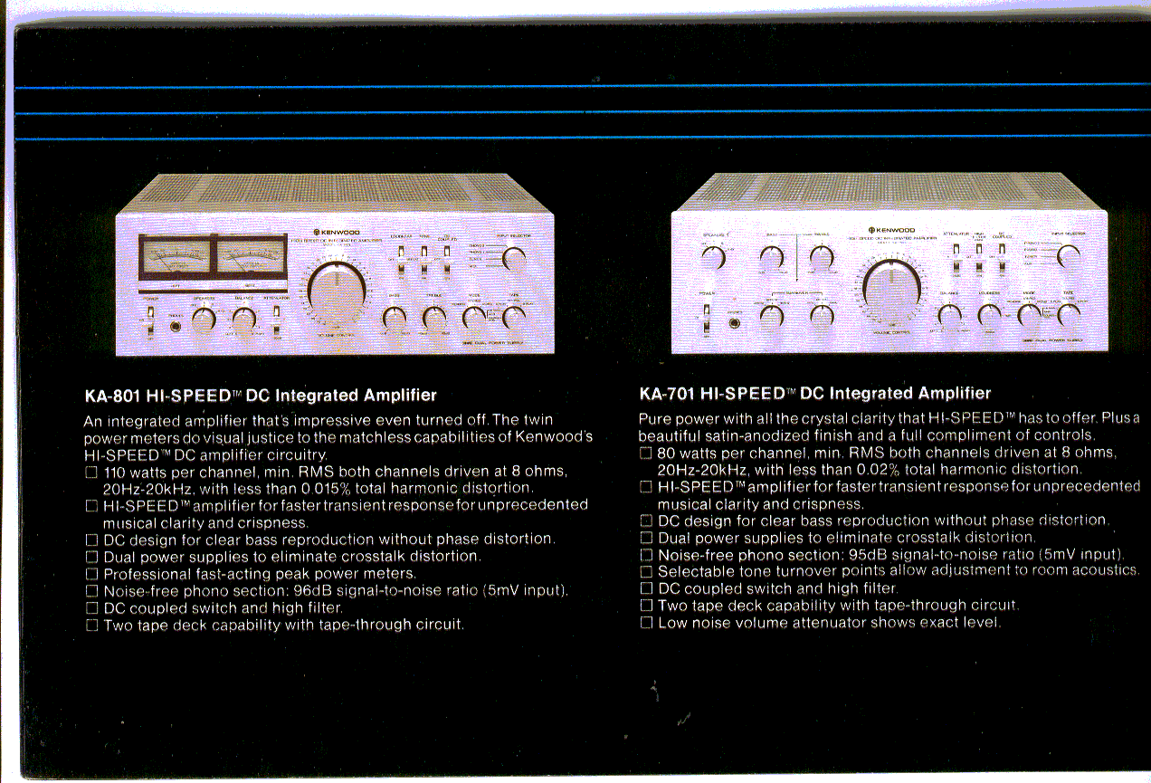 Here are images of the tuner, receiver and amplifier pages from two Kenwood product brochures. Click to enlarge them for best picture quality.