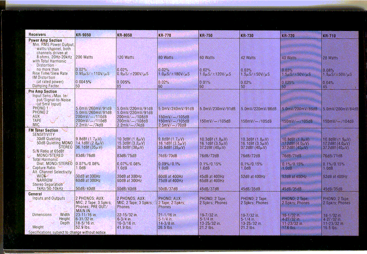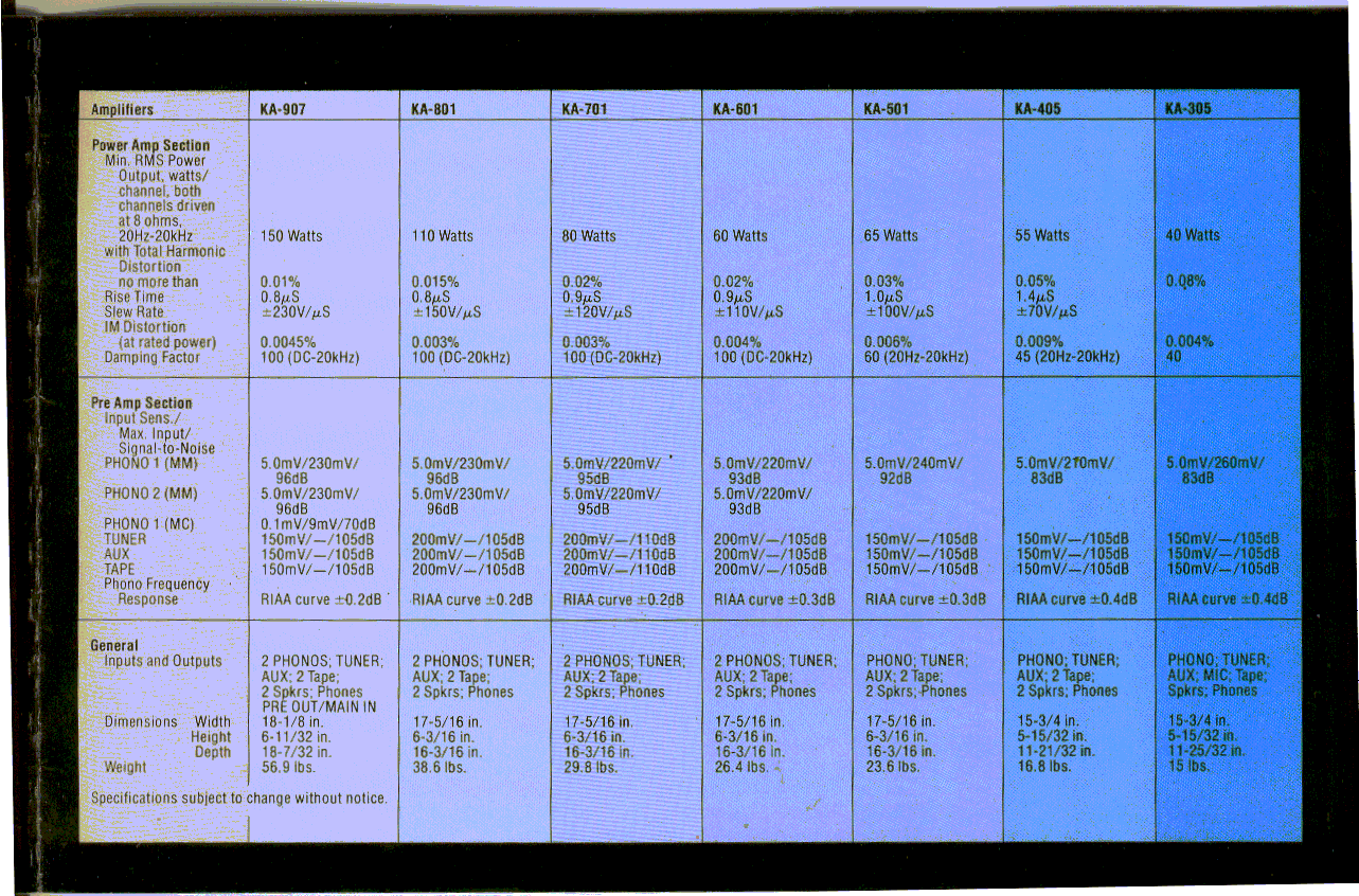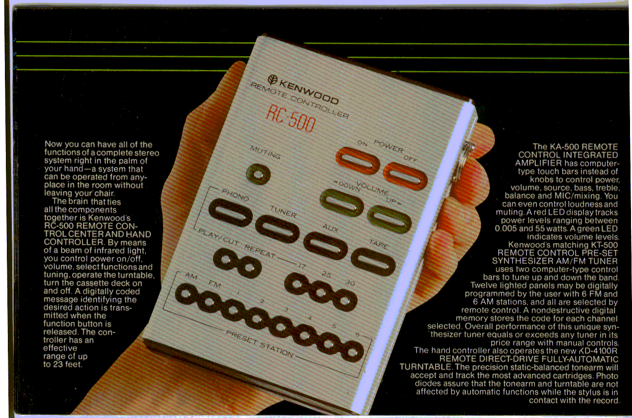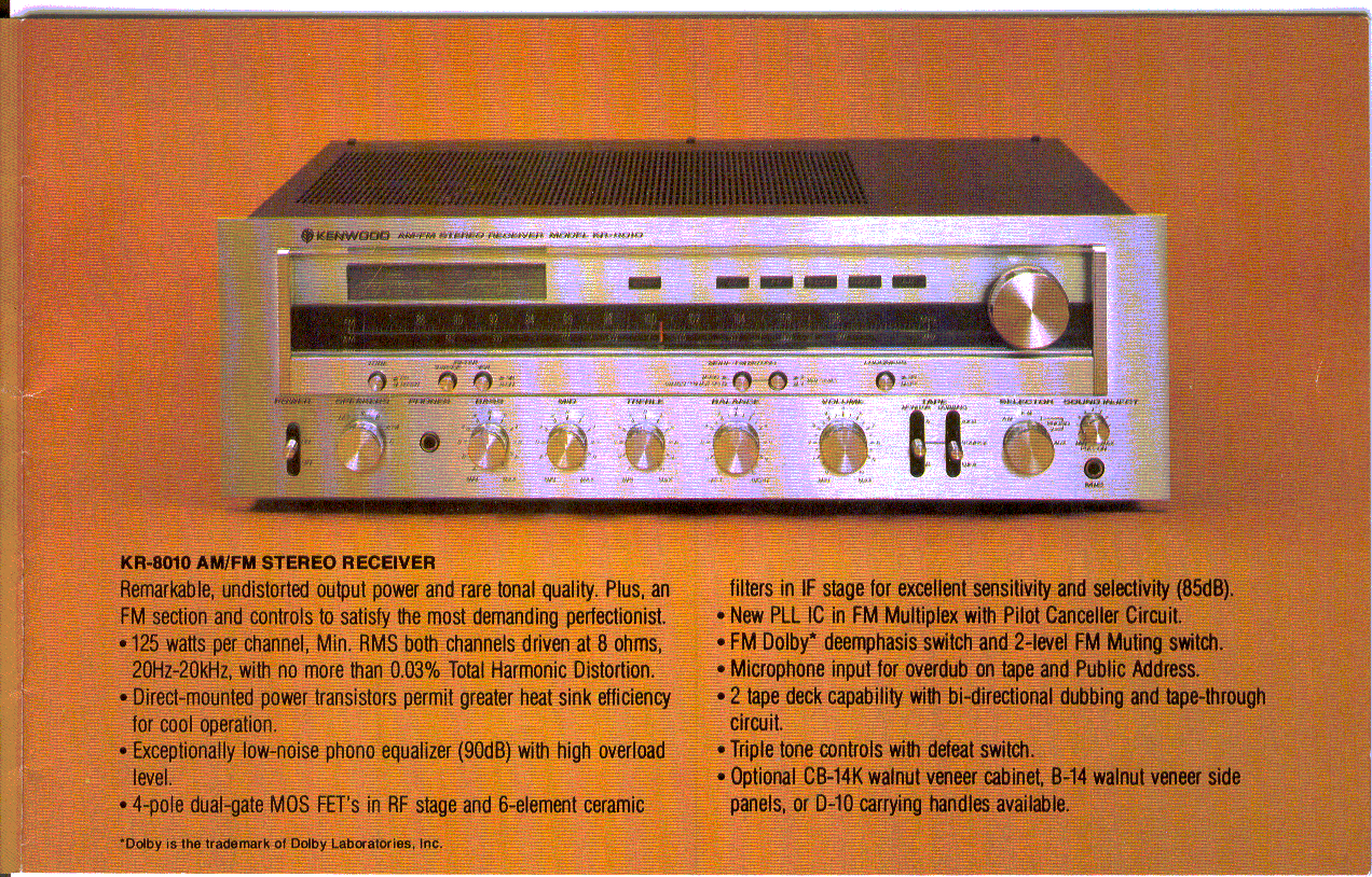 Here are images of the tuner, receiver and amplifier pages from two Kenwood product brochures. Click to enlarge them for best picture quality.