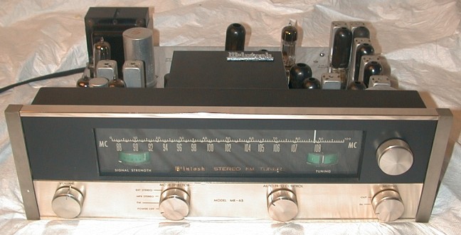 Our panelist Bob reports on the MR 65 and its relatives: "I just finished an alignment of a beautiful MR 65 and was really pleased with the results. I was really surprised to see that this tuner had 4 gangs, unlike 99% percent of tube tuners that only had three. There are two gangs after the antenna input. Actually, it is the same setup as the MR 66, the AM-FM model. The MR 65 has station-pulling ability just about as good as a decent 4-gang solid-state tuner, and maybe better than some. It passed my 94.3/94.5 adjacent channel test with flying colors. The sound quality stock needs some work - it's not bad, but the old coupling caps need updating to deliver the goods. Overall, a pleasant surprise. These go pretty cheap for McIntoshes, so I give it a 'good buy' rating. I paid $300 for a piece with some cosmetic problems that needed cleaning and alignment. But it has an MPX circuit installed, which was optional. The MR 65B is similar in looks and function, but adds a front-panel stereo light, uses a 6DS4 Nuvistor instead of the 6BN4A for the RF amp, and uses a solid-state rectifier. The follow-on MR 67 is also similar in circuit function, but has a different front panel and meter setup, and drops back to a 3-gang front end."