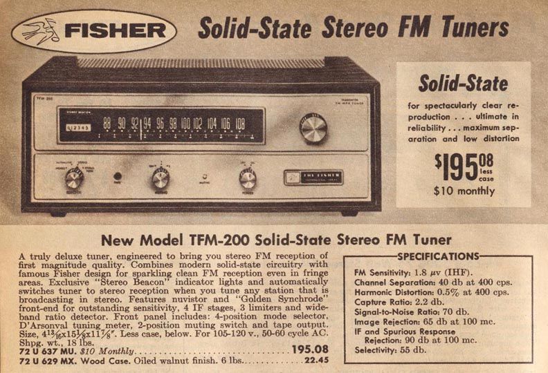 Stereo: KM-60 (photo1, photo2), KM-61 (photo), FM-50-B, FM-100-B (photo), FM-100-C (photo1, photo2, book), FM-100T (tuner/preamp), FM-200-B (photo1, photo2, inside - 4 gangs, $350-4505 on eBay), FM-200-C (photo), FM-202-R (photo, manual), FM-1000 (photo, manual, $878 on eBay in 11/03, $860 in 12/07), TFM-200 (photo, ad), TFM-1000 (1967, $499, photo)